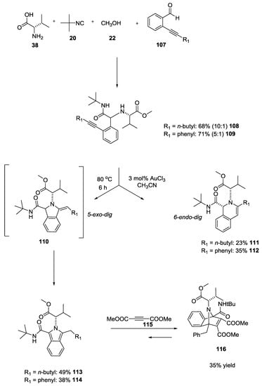 Chiral highly functionalized dihydroisoquinolines and isoindoles were synthesized by Dyker and coworkers using U-5C-4CR followed by a gold-catalyzed hydroamination [,]. Dyker et al. used L-valine as the chiral amine component, and benzaldehydes with an alkyne moiety to generate highly functionalized secondary amines converted in dihydroisoquinolines 111 and 112 by a 6-endo-dig cyclization (23% and 35% yield) or in isoindoles 110 by a 5-exo-dig cyclization and subsequent aromatization such as in 113 and 114 (38% and 49%, Scheme 24). A further tandem Diels Alder reaction was carried on isoindole derivatives using acetylene dicarboxylic acid dimethyl ester 115.