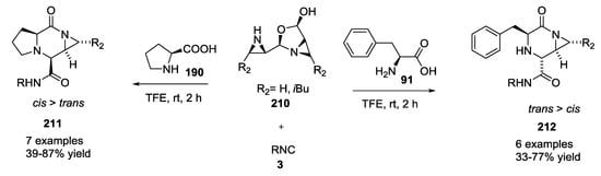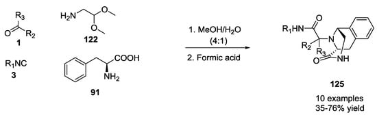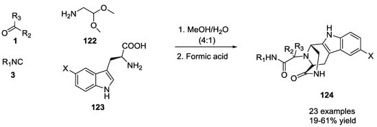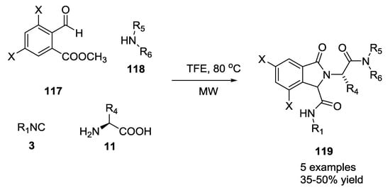 The Pictet–Spengler reaction was recently applied in tandem as Ugi post-condensation transformation to yield complex polycyclic scaffold (Scheme 25). In these cases, the U-5C-4-CR adducts were reacted in one pot, without any purification, for the subsequent Pictet–Spengler cyclization [,,]. This procedure was successfully carried out on differently functionalized Ugi scaffolds in order to obtain a wide range of multi-functionalized heterocycles. Isoindolone scaffold 119 was obtained by introducing methyl 2-formylbenzoate as the oxo-component and by monitoring the reaction via supercritical fluid chromatography-mass spectrometry (SFC-MS). Primary amines provided diastereomeric ratios of 70:30, and only the major diastereomer was precipitated during the reaction. In contrast, secondary amines gave four stereoisomers in equal ratios, suggesting racemization of the amino acid (Scheme 25).