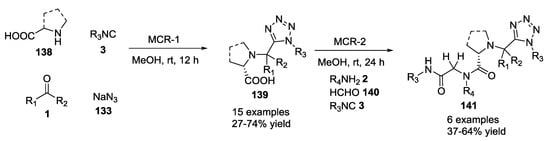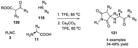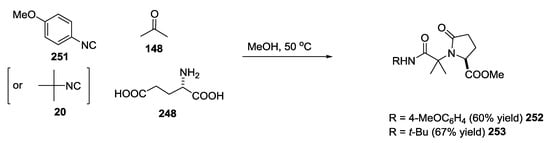 The U-5C-4CR was conducted also by using ketones instead of aldehydes []. Due to the low reaction rate of ketones, the reaction time increased from approximately one day to several weeks (4 examples, 64–94% yield). The same authors reported the formation of cyclic analogues, which are reported in Section 3.