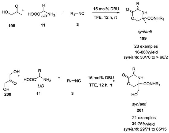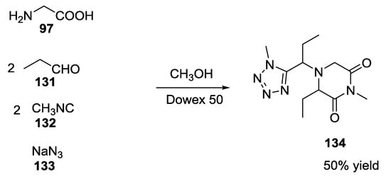 - Ugi, I.; Hörl, W.; Hanusch-Kompa, C.; Schmid, T.; Herdtweck, E. MCR 6: Chiral 2,6-piperazinediones via Ugi reactions with a-amino acids, carbonyl compounds, isocyanides and alcohols. Heterocycles 1998, 47, 965–975. [Google Scholar] [CrossRef]