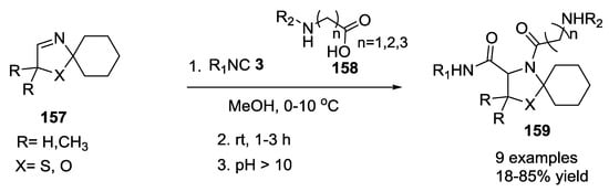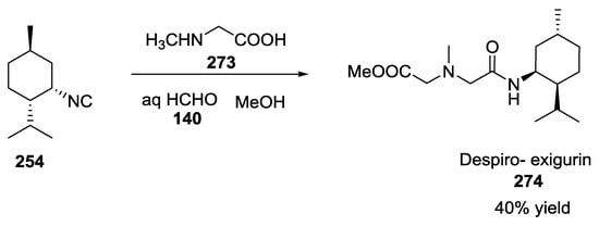 Analogously, the syntheses of despiro analogues of exigurin 274 (Scheme 73) and boneratamide B–C (Scheme 74) were explored using the same U-5C-4CR [].