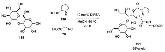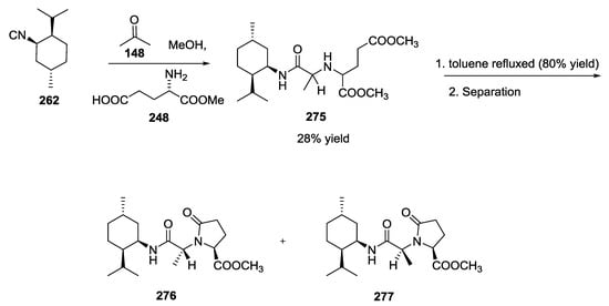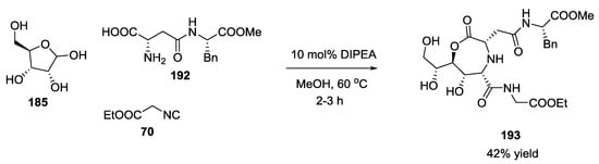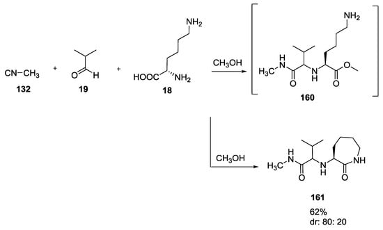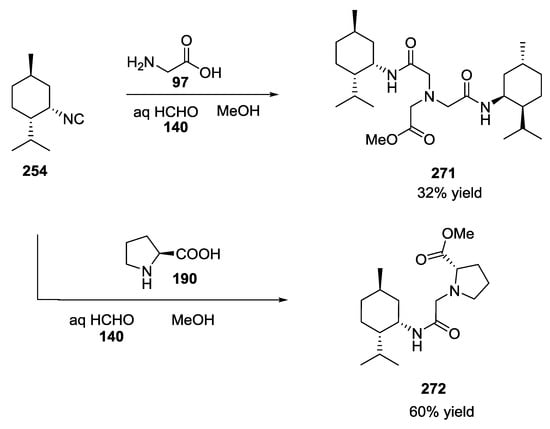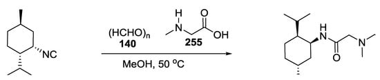 Halichonadin G is a natural marine product isolated in 2011 by Kobayashi and co-workers from the sponge Halichondria sp. Yoshiyasu and coworkers hypothesized the natural synthesis of Halichonadin G from a natural precursor, i.e., Halichonadin C, considering a putative “ugiase” that might promote a Ugi reaction (Scheme 70) []. In contrast to Boneratamide A–C, the synthesis of Halichonadin G using N-unprotected α-amino acids was unsuccessful, giving only undesired products. However, the use of N-benzylglycine allowed biomimetic U-5C-4CR, a menthyl analogue of Halichonadin G.