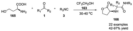 - Park, S.J.; Keum, G.; Kang, S.B.; Koh, H.Y.; Kim, Y.; Lee, D.H. A facile synthesis of N-carbamoylmethyl- α -aminobutyrolactones by the Ugi multicomponent condensation reaction. Tetrahedron Lett. 1998, 39, 7109–7112. [Google Scholar] [CrossRef]