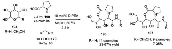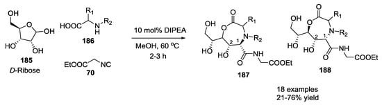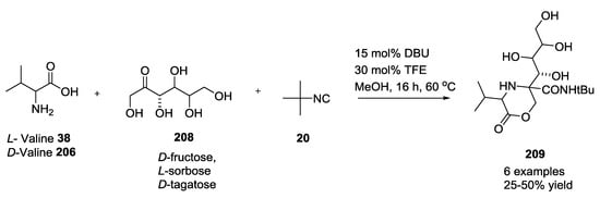 - Voigt, B.; Linke, M.; Mahrwald, R. Multicomponent cascade reactions of unprotected carbohydrates and amino acids. Org. Lett. 2015, 17, 2606–2609. [Google Scholar] [CrossRef] [PubMed]