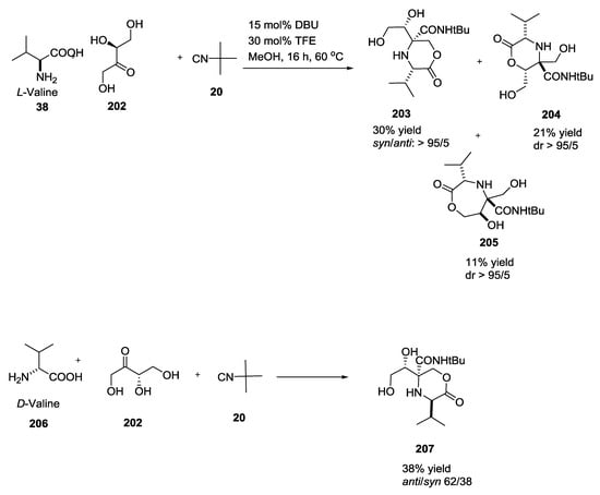 - Richter, C.; Trung, M.N.; Mahrwald, R. Multicomponent cascade reactions of unprotected ketoses and amino acids—Access to a defined configured quaternary stereogenic center. J. Org. Chem. 2015, 80, 10849–10865. [Google Scholar] [CrossRef] [PubMed]