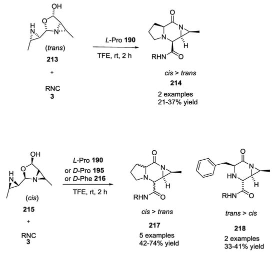 - Heine, N.B.; Kaldas, S.J.; Belding, L.; Shmatova, O.; Dudding, T.; Nenajdenko, V.G.; Studer, A.; Yudin, A.K. Synthesis of chiral piperazinones using amphoteric aziridine aldehyde dimers and functionalized isocyanides. J. Org. Chem. 2016, 81, 5209–5216. [Google Scholar] [CrossRef] [PubMed]