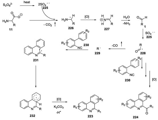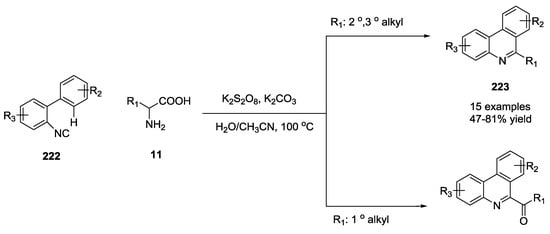 - Lu, S.-C.; Li, H.-S.; Gong, Y.-L.; Wang, X.-L.; Li, F.-R.; Li, F.; Duan, G.-Y.; Xu, S. Use of unprotected amino acids in metal-free tandem radical cyclization reactions: Divergent synthesis of 6-alkyl/acyl phenanthridines. RSC Adv. 2017, 7, 55891–55896. [Google Scholar] [CrossRef]