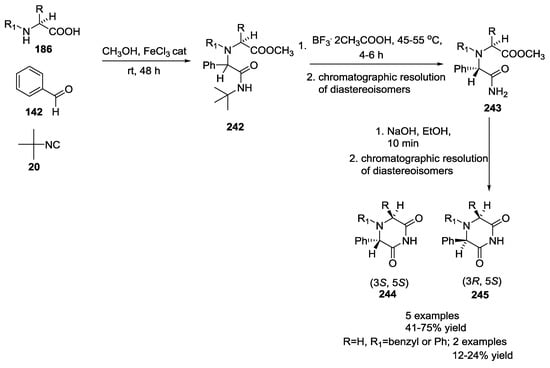 - Zaretsky, S.; Adachi, S.; Rotstein, B.H.; Hickey, J.L.; Scully, C.C.G.; Denis, J.D.S.; Courtemanche, R.; Yu, J.C.Y.; Chung, B.K.W.; Yudin, A.K. Stereocontrolled disruption of the Ugi reaction toward the production of chiral piperazinones: Substrate scope and process development. J. Org. Chem. 2014, 79, 9948–9957. [Google Scholar] [CrossRef]