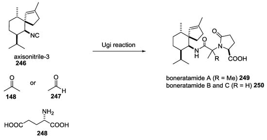 - Ichikawa, Y.; Saito, K.; Nishimori, A.; Kotsuki, H.; Nakano, K. A biomimetic approach to terpenes isolated from marine sponges: A Ugi coupling reaction in a hypothetical biosynthesis. Synlett 2013, 24, 757–761. [Google Scholar] [CrossRef][Green Version]