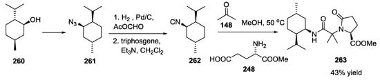 Synthesis of the despirocyclic boneratamide A analogue 263 was also explored by preparing the isocyanide 262 from (+)-menthol 260 via azide formation 261, hydrogenation to amine, formamide formation and final dehydration (Scheme 69).