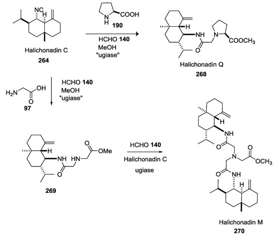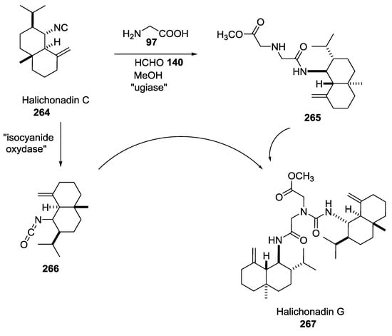 The Kobayashi group isolated Halichonadins M–Q, from the light-brown marine sponge Halichondria sp. collected at Unten Port in Okinawa Island. Like other terpenes previously described, the natural synthesis could start from Halichonadin C isocyanide 264 by a putative “ugiase” (Scheme 71).