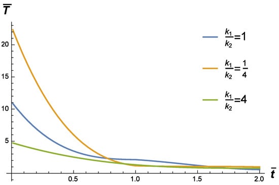 where subscripts 1 and 2 mark bodies 1 and 2, respectively, and n is the common normal at the joint surface. In Equation (15), it is assumed that in the general case, the heat conduction in one of the bodies is described by the equation with the Caputo derivative of the order , whereas in the second body, the process is governed by the equation with the Caputo derivative of the order .