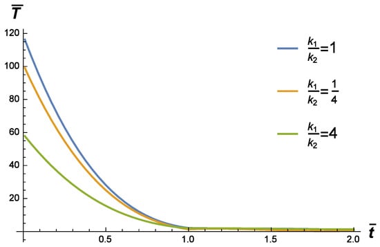 A variety of boundary conditions for the time fractional heat conduction equation were analyzed in [,,,]. If the surfaces of two bodies are in perfect thermal contact, the temperatures at their joint boundary S and the heat fluxes through this boundary are the same for both bodies, and we arrive at the following boundary conditions: