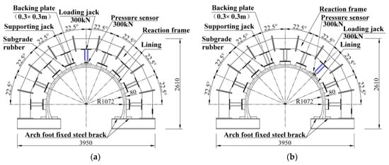 Taking the existing lining loading test device as the reference [], a lining loading test setup was developed, as shown in Figure 1. The model test setup includes a reaction steel frame, nine electro-hydraulic jacks, and equivalent subgrade setup. The size of the loading device was designed according to the 1:5-scale of the section of a two-lane highway tunnel in China. The reaction steel frame was assembled by M30 bolts with 9 H-shaped steel members, with dimensions of 3950 mm (width) × 2610 mm (height) × 300 mm (thickness). Nine loading points were set around the lining: one active loading point and eight passive loading points. Active load was applied by setting an electro-hydraulic jack at the active loading point, such as vertical loading at the crown (Figure 1a) and oblique loading at the spandrel (Figure 1b). Rubber plates were installed at the remaining passive loading points and were used to simulate subgrade reaction. The size of a single rubber plate was 0.3 m × 0.3 m, and the thickness was 100 mm. Uniaxial compression test of the rubber plate indicated that the compressive stiffness of the rubber plate was 3.38 MN/m. A total of eight rubber plates were used to simulate the formation constraints of the lining model test and the equivalent formation resistance coefficient was calculated to be 27.9 MPa/m [,,].