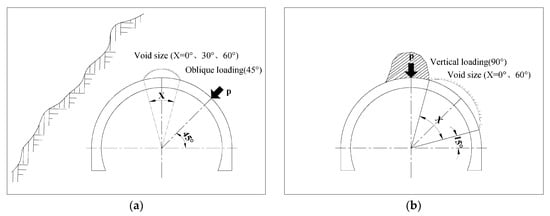 Common soil pressure modes causing deformation and failure of lining: (a) Void at crown, oblique loading (45°); (b) void at spandrel, vertical loading (90°).