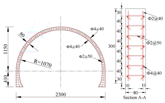 When the influence of self-weight on the structure is not considered and the external load is concentrated, the prototype material can be used for the model test []. Therefore, this test used prototype materials to make the lining members. The lining member was based on a common two-lane road tunnel lining in China. It was made according to the 1:5-scale. The lining member was 2.3 m wide, 1.56 m high, 80 mm thick, and 300 mm long longitudinally. The reinforcement ratio of the prototype lining was 0.7%. The conversion was conducted according to the principle of equal reinforcement ratio. The model lining adopted the steel bars with a diameter of 4 mm and the distance between two steel bars is 40 mm, also the distributed steel bars with the diameter of 2 mm, and the distance of 50 mm between two steel bars. The dimensions and reinforcement drawings of the lining member are shown in Figure 3. After 28 days of maintenance, the lining members were moved into the loading setup where the test sensors, rubber plates, and loading jacks were arranged.
