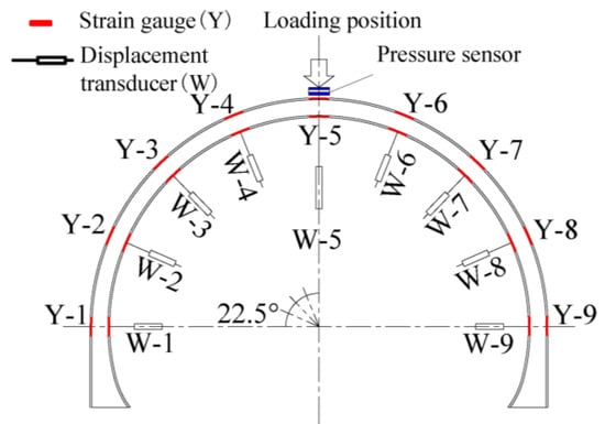 The values of load, displacement, and strain during the loading process of the lining were collected by using pressure sensors, strain gauges, and displacement transducers in this test. Taking the vertical loading at the crown as an example, the arrangements of this test are shown in Figure 4. The displacement control loading mode with loading rate of 0.5 mm/min was adopted. Crack distribution and crack width were recorded before the lining was broken.