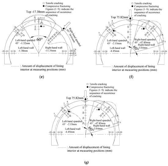 The cracks, deformation distribution and failure modes of RC lining under different size of voids are shown in Figure 6, where “○” symbolizes the tensile cracks, “●” symbolizes the compression fracture, numbers 1–x stand for the orders of cracking, and the dotted lines indicates lining deformation. Photographs of the deformation and the cracks distribution void size 30° at the crown and void size 60° at the spandrel are shown in Figure 6a,b, respectively. For the 45° oblique load, the RC linings under different size of voids at the crown had similar failure patterns (Figure 6c–e). First cracking was observed inside the lining of the loading point, then the outer lining at the edge of the void, and at the springline began to crack; with the propagation and expansion of cracks in the spandrel and the crushing of the lining in the range of the void and the springline, three plastic hinges were formed to destroy the lining completely. As the void size in the crown increased, the lining deformation within the range of the void became larger and the lining damage was concentrated on the void. For the case of the void at the spandrel, the failure pattern was similar to that of the void at the crown (Figure 6f–g). The lining was destroyed by the penetration of cracks at the crown and the collapse of both sides of the spandrel. Consistent with the influence of void at the crown, the lining deformation increased by 3.8 times with the increase of the void at the spandrel ranging from 0° up to 60°. As a result of the voids, the lining lost the restriction of surrounding rocks and was more easily deformed under load. A larger void corresponded to the larger deformation and the easier occurrence of damage of the lining at the void.