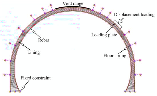 ABAQUS was used to establish the calculation model for the lining under the five test cases. The lining and the loading plate were simulated by the CDP model and linear elastic model in this numerical model, respectively. Tunnel lining concrete was meshed with 4-node reduced integration quadratic plane strain elements (CPE4R), truss element T2D2 for stimulating the reinforcement bar, and compressive spring element for surrounding rocks. The number of cells of lining and steel bars is 7020 and 1076 respectively for the numerical model with the case of no defects. According to the boundary conditions of model tests, fixed constraints (U1 = U2 = UR3 = 0) were applied at the bottom of the lining and displacement loading was applied. The typical finite element model is shown in Figure 8.