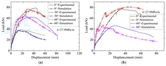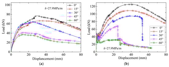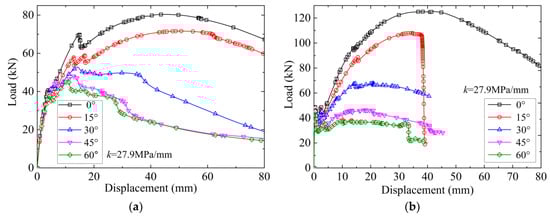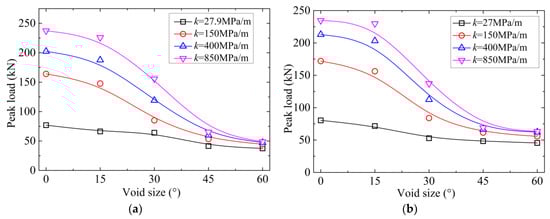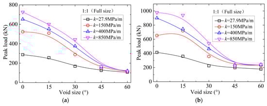Soil stiffness has a substantial effect on the mechanical behaviors of the lining []. In this paper, combined with the recommended values of the elastic resistance coefficient of the surrounding rocks of Grade III–V [], four types of soil stiffness such as k = 27.9 MPa/m (test), 150 MPa/m, 400 MPa/m, and 850 MPa/m were selected to analyze the effects of the void on the bearing capacity of the lining with different soil constraints. Taking the vertical and oblique loads as an example, the relation curves between the peak load of the RC lining and the void size under different soil stiffness were obtained, as shown in Figure 15.