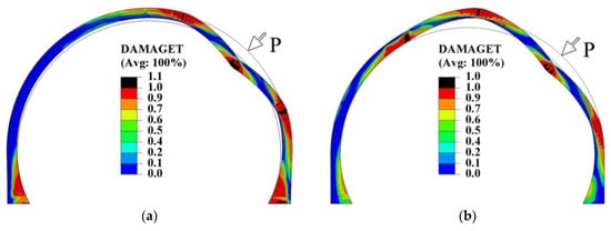 A comparison of the calculation results of the RC lining with no void under mesh sizes of 5, 10, and 20 mm found that the load–displacement curves and peak loads under the three mesh sizes were close, indicating that the simulation results of lining under different mesh sizes converged. Compared with the 10mm mesh model, the calculation of using the 5 mm mesh model will be time-consuming due to the large number of elements; and that of the 20 mm mesh size will be too rough. Considering the computational efficiency and simulation effect comprehensively, subsequent calculations were performed on 10 mm meshes. The tests and calculation results of the load–displacement responses of lining under different size of voids (Figure 9) show that the shape of the load–displacement curves and the variation with the void ranges were the same. When the size of the void at the crown was 0°, 30°, and 60° (Figure 9a), the peak loads obtained by numerical simulation were 77.0, 64.1, and 37.4 kN, respectively, which were 2.0%, 3.1%, and 6.2% different from the trial values, respectively. When the size of the void at the spandrel was 0° and 60° (Figure 9b), the peak loads obtained by numerical simulation were 80.4 and 46.8 kN, respectively, which were 4.3% and 2.0% different from the trial values, respectively. A comparison of the simulated damage distribution chart (Figure 10) and the experimental damage pattern chart (Figure 6) shows that the failure patterns of the two were consistent and the failure locations of the lining were identical. These findings show that the finite element simulation results are reliable and can reflect the main stress characteristics of the lining considering the influence of the void.