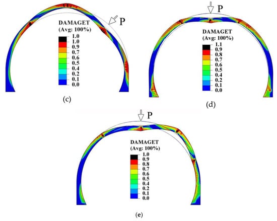 Deformation and damage distribution of tunnel lining: (a) Void size 0° at the crown; (b) void size 30° at the crown; (c) void size 60° at the crown; (d) void size 0° at the spandrel; (e) void size 60° at the spandrel.