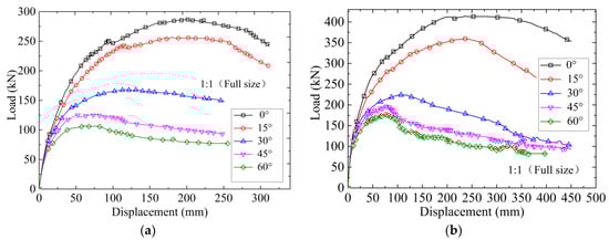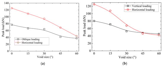 Under the oblique and vertical loads (Figure 12a and Figure 13a), the lining load–displacement curves of different void sizes were similar. However, as the void size increased, the slope of the curve decreased before the peak load, and the peak load and its corresponding displacement also declined. This finding shows that the existence of voids did not change the morphology of the load–displacement curve but reduced the mechanical properties of the lining considerably. Under the horizontal load (Figure 12b and Figure 13b), the lining load–displacement curves of different void sizes were markedly different. With the increase of the void size, the last part of the load–displacement curve showed a sudden drop, and the failure displacement of the lining was small, showing brittle failure characteristics. Compared with that under the oblique and vertical loads, the bearing capacity of the RC lining under horizontal load was considerably higher because the position of the horizontal load was close to the bottom of sidewall, and its restraining effect of the fixed constraint caused the lining to have a larger bearing capacity, smaller failure displacement, and more concentrated failure locations.