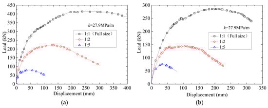 Figure 16 shows that the load–displacement curves of different lining sizes were similar in shape; as the lining size increased, the peak load and the corresponding displacement increased rapidly and the load carrying capacities of different-sized linings were not size proportional. When the soil stiffness was k = 27.9 MPa/m, compared with 1:5-scale model lining, the bearing capacity of the full-size tunnel lining increased from 80.4 kN to 414.1 kN under vertical load, which increased by 4.2 times, and the corresponding displacement of peak load increased from 45.8 mm to 236.7 mm, which was also 4.2 times higher. Under full-size conditions, the morphology of the lining load–displacement curve (Figure 17) and the variation law of the peak load with void size (Figure 18) under different voids were similar to those of the 1:5-scale model lining. Taking the full-size lining as an example (k = 850 MPa/m), the void size at the crown increased from 0° to 45°, and the lining load carrying capacity reduced from 725.9 kN to 164.8 kN with the drop of 77.3%; the void size increased from 45° to 60° with a slight decrease in bearing capacity. Similarly, the void size at the spandrel increased from 0° to 45° and the bearing capacity of the lining decreased from 978.5 kN to 221.7 kN, which dropped by 78.4%. Later, the change in the void size had a minimal effect on the bearing capacity.