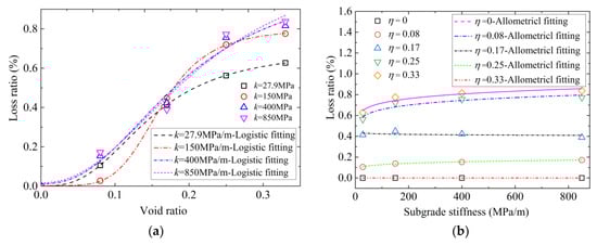 Relationships of loss rate of load carrying capacity and void ratio and subgrade stiffness: (a) Void ratio; (b) subgrade stiffness.