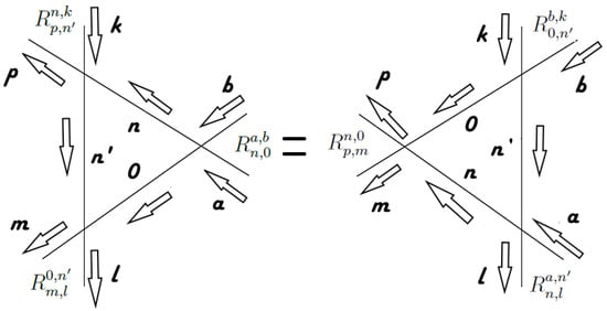 The sub-index means degenerate vacuum. We have introduced pairs of complete set of intermediate states defined by . In addition, we are summing over the multiplicity of vacuums . We will justify this operation at the end of this paper. The sum over the vacuums is represented by the contraction between the indices 0 in Equation (32). Note that the vacuum will then appear as internal lines in the graphical version of the QYBE as it is shown in Figure 2. Here, we will further explain the meaning of the free indices. The free indices corresponding to the Nambu-Goldstone field and broken generators are indices living in the corresponding spaces of the Goldstone bosons or the degenerate vacuum. For example, in the matrix , the index p lives in the space of the family of Goldstone bosons represented by n; meanwhile, the index k lives in the space of the family of Goldstone bosons represented by . This matrix then represents the interaction of pairs of Goldstone bosons (n and ) and we can perceive the pair of indices k and p as the labels representing such interaction in the vertex of the Yang-Baxter diagram. Consider now the Nambu-Goldstone field in Equation (34). In this case, the pair of indices represent the interaction between the Goldstone bosons n with the vacuum . Then, we can think on as the Nambu-Goldstone field touching the legs corresponding to n and in the diagrams. Analogous conclusions apply to the broken generators. In order to agree with the ordinary commutators, we will take as the fundamental labels for the broken generators those indices living in the spaces corresponding to the different families of the Goldstone bosons. If one broken generator has two indices living in different families of Goldstone bosons n and , then we will take as the fundamental label the index living in the space belonging to the family of Goldstone bosons, which is not a common vertex with respect to another broken generator. Then, for example, in Equation (34), we will consider the indices l and p as the real labels for the broken generators. Then, and will represent the same broken generators in Equation (34). Analogously, and will also correspond to a single broken generator. For the case of the Nambu-Goldstone field, the situation is different, and the fundamental index is the one living in the vacuum space. Then, and in such a case the fundamental index will be b, which lives in the space . Then, in this way, Equation (34) could be expressed in a simplified notation as
