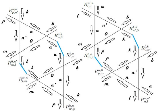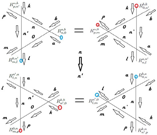 Note that the index notation is consistent. This can be observed from Figure 2. In the figure, each line in the triangles represents one space. Then, for example, the index group b, 0 and m live in the same space and the group of indices represented by k, and l lives in another space. This statement appears consistently in the matrix , where 0 and m, appearing vertically one over the other, implies that they are connected to the same space. The same logic applies to the pair and l in the same matrix. The same consistency appears if we repeat the same reasoning over the matrix in Equation (33). The same analysis can be repeated over all the other matrices. It is important to understand that we can only contract pairs of indices living in the same space. This can be seen clearly from the QYBE in Equation (32). The contracted group of indices represent either gapless intermediate particles or the degenerate vacuum and this means that the QYBE demands us to sum over all the possible vacuums. On the other hand, the free indices like b, p and l are the labels of the Nambu-Goldstone field and the pair of broken generators. Since b is connected to the same space of the index 0, then this means that the Nambu-Goldstone field will always appear operating over the vacuum in the different expressions. Repeating the same reasoning, the index p is the label of the broken generator related to the modes n and the index l is the label for the broken generator related to the modes . Finally, the indices a, k and m are auxiliary. They are just telling us where should be located the modes n, as well as the degenerate vacuum when we expand the different expressions in the commutator representing the spontaneous symmetry breaking condition. This point will be clearer in a moment. Look, for example, that the index a is always tied to the mode n. Then, whenever it appears, it is indicating to us that the mode n appears as a bra or as a ket for the corresponding operator. From Equation (32), the following equality is satisfied