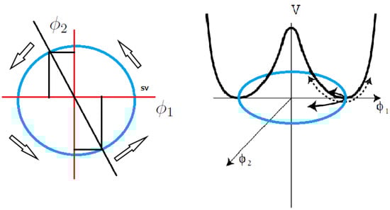 The degenerate vacuum corresponding to the Nambu potential. The black line crossing the circumference suggests that, for each positive value of the order parameter on a given vacuum (expectation value), there is a corresponding negative value with the same magnitude but defined in a different vacuum. Then, summing over the expectation values of the of the order parameters, obtained along the degenerate vacuum gives a trivial (vanishing) result. The arrows illustrate the direction of the sum. The right-hand side of the figure is the potential term defined in Equation (48) and the left-hand side is the same potential observed over the plane. The right-hand side is partially taken from [] and briefly modified.