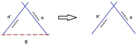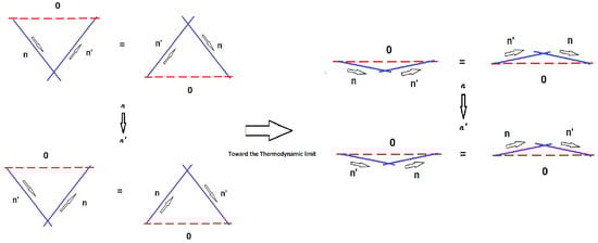 where is just the volume of the system. This confirms that, at finite volume approximation, the vacuums are non-orthogonal. In addition, in the same limit, the momentum of the intermediate particles is non-zero as can be observed from the illustration given in Figure 6. Note that, on the left-hand side of Figure 6, the slopes of the lines representing the Nambu-Goldstone bosons n and are larger than the slopes taken at the thermodynamic limit (right-hand side of the same figure). In the thermodynamic limit, the three lines in the triangle are (almost) parallel and the Nambu-Goldstone bosons are gap-less particles. If there is any external fluctuation at the thermodynamic limit, then the degeneracy of the vacuum is reduced to only one arbitrarily selected vacuum as can be observed from Figure 7. In the same figure, when the red-dotted line disappears, then there is no degeneracy of the vacuum. Independent of the situation under analysis, nothing forbids us in summing over the degenerate vacuum and this can be interpreted as a superposition of the different vacuum expectations value of the order parameter, which gives the trivial result (53). The result has a direct correspondence with the QYBE. It is important to remark that the spontaneous symmetry breaking condition is time-independent only in the thermodynamic limit [].