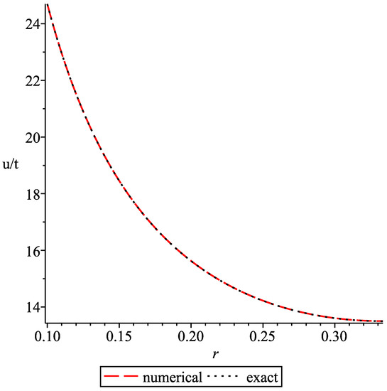 and a line source at the origin, supplying mass at total rate Conceivably, this line source could be along the beam of an ionising laser. The exact solution is plotted in Figure 1, where it validates a numerical solution from the MAPLE routine pdsolve [21]. Over the domain with where varies from 13–25, the numerical and exact solutions agreed to within . However, the numerical PDE solver failed to recover the exact solution when the inner radius was less than 0.1.