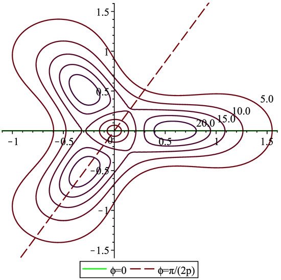 Contours of scaled density from Equation (44) with p = 1.5. Contour levels vary from zero at and to 29.24 at .