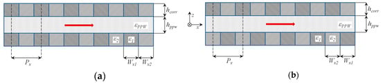 The dielectric waveguide structure of interest is shown in Figure 1. It is a parallel-plate waveguide (PPW) with top and bottom walls realized using dielectric corrugations. The period of corrugations is denoted by Px, the height of corrugations by hcorr, the width and permittivity of periodic dielectric inclusions by Wx1, Wx2 and ε1, ε2, and the height and permittivity of parallel-plate waveguide by hppw and εppw. Note that the plane z = 0 is located in the middle of the parallel-plate region. We will first analyze the simple periodic structure (i.e., the one with classical translation/mirroring symmetry, see Figure 1a) and then we will modify the analysis procedure for structures with higher symmetry in which the corrugations are shifted with respect to each other by Px/2, i.e., the structure will be glide-symmetric, as in Figure 1b.