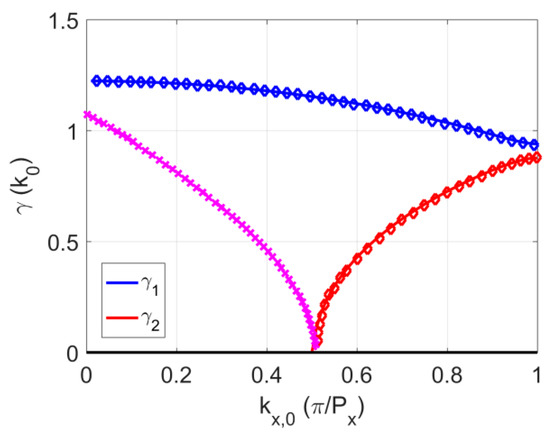 Normalized value of the propagation constant of the first two modes travelling along the periodic array of dielectric slabs; solid line—results calculated using the developed program, diamonds—calculated results from Reference []. γ2 = 0 is the cut-off condition of the 2nd mode, thus for the values kx,0 smaller than the cut-off value (0.5·π/Px) γ2 is imaginary (the mode is evanescent).