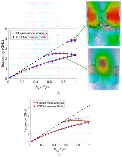 Propagation constant of the first two modes travelling along the glide-symmetric dielectric waveguide with corrugations (Figure 1b); solid line—results calculated using the developed program, diamonds—results calculated using CST Microwave Studio (dashed black line represents the light-line); (a) glide-symmetric structure only, (b) comparison of glide-symmetric and simple-symmetric structures (blue dashed line). The E-field distribution in the unit cell of the first two modes for kx,0 = π/Px is also shown (the structure is infinite in the y-direction).