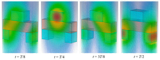 The E-field distribution in the unit cell of the first mode for kx,0 = π/Px at different time moments where T denotes the period of oscillations (T = 1/f).