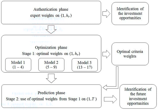Stage 1: Suppose, firstly, that for the first period , where the investment opportunities are identified and we know the that ri, where i = 1, …, m, is the yield of government bonds of the country i in the next period , while (A12) holds true. Then, for the period from 1 to hr, the criterion weights can be found as solution to the following optimization problem as Model 1: