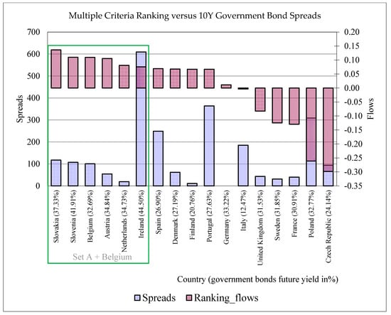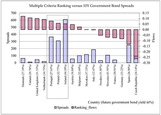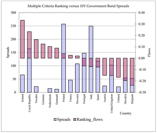Promethee II was used to obtain the net flows of the countries according to the macroeconomic criteria in the first period 2000–2010. The net flow values, the values of the spreads (Spreads), and the values of 10-year government bonds yields in the next period, 2010–2018 (GB10YR), are presented in Table 3 and Figure 2. The spread is defined as the difference between the yield to maturity of the 10-year government bond of a country and the Germany government bond with the same maturity. Germany is considered as a neutral economy in terms of yields and can therefore serve as a benchmark. The higher the value of the net flow, the better the country is outranked according to its macroeconomic characteristics, and a positive value leads to a “good” rating, and negative to a “bad” one.