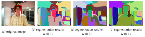 As seen in Equation (1), the segmentation parameter tuple Ti is also an important parameter. Ti is a set of parameters that can affect the segmentation result greatly. Different segmentation algorithms always relate to different parameters. For the efficient graph-based image segmentation algorithm [21] employed in this work, each tuple contained three parameters including (used to smooth the input image before segmenting it), k (value for the threshold function), and m (minimum component size enforced by post-processing). As shown in Figure 2, when we use the same segmentation algorithm [21] but employ different segmentation parameter tuples, the segmentation results are quite different. In addition, with the three different segmentation results, the corresponding superpixel sets are also quite different from each other. From Equation (1), we can find that the calculation of SS-based objectness highly depends on the shape and distribution of the superpixels in the image. To apply the objectness measure for weighting the training samples, we then proposed a neutrosophic set-based scheme to handle such a problem.