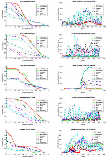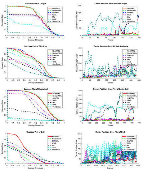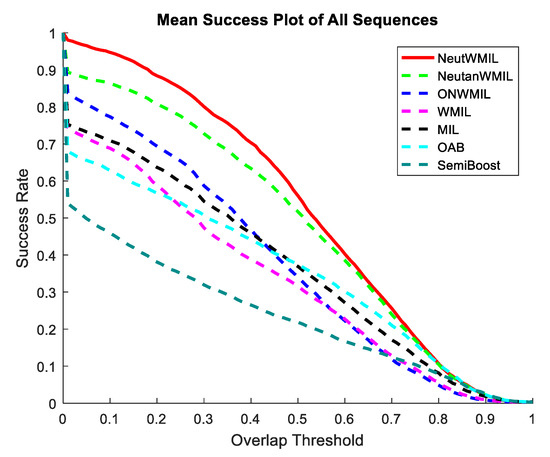 Details of each tested video sequence are given in Table 1. 14,163 frames are evaluated here. The challenge degree grew with the increase in the NC value. The average center location errors for the tested trackers are shown in Table 2. We can see that the NeutWMIL tracker ran the best in 13 sequences, and it performed the second best in four sequences. The NeutanWMIL tracker performed the best in four sequences and the second best in six sequences. The results of the corresponding average overlap ratio are given in Table 3. We can see the NeutWMIL tracker had the best performance in 12 sequences and the second best in six sequences. The NeutanWMIL tracker performed the best in five sequences and the second best in eight sequences. Figure 5 shows the plot of average success of the evaluated trackers through all the sequence. We can see that the NeutWMIL tracker performed the best, and the NeutanWMIL tracker had the second best performance. We can also find that there is a big gap between the NeutWMIL tracker and the WMIL tracker, as well as the MIL tracker. Based on the last line of both Table 2 and Table 3, a conclusion can also be drawn that the proposed NeutWMIL tracker performs the best, and the proposed NeutanWMIL tracker performs the second best.