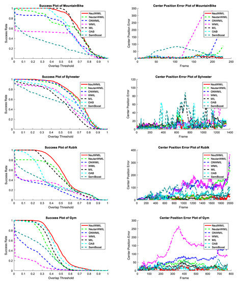 Success and center position error plots of tested sequences MountainBike, Sylvester, Rubik, and Gym.