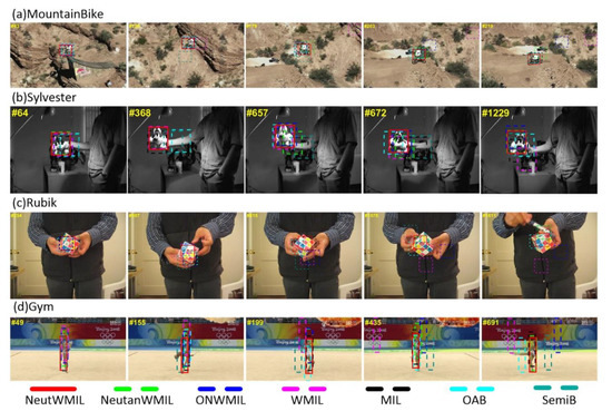 As shown in Table 1, the first two sequences were with three types of challenges. The main challenges were in-plane and out-plane rotation, and there was a background clutter challenge in the MountainBike sequence, and illumination variation challenge in the Sylvester sequence. As seen in Figure 9a, the SemiB tracker yielded a severe drift problem at frames #43, #126, and #179. The WMIL tracker failed due to the background clutter, as shown by frames #126 and #179. When the biker passed by the area with more challenging background clutter, the NeutanWMIL and ONWMIL trackers produced wrong object locations, as seen in frame #219. The OAB and SemiB trackers drifted away on account of the in-plane and out-plane challenge, as shown by frames #64 and #368 in Figure 9b. Due to the rotation and illumination variation challenges, the trackers drifted from the object except the NeutWMIL tracker, as shown by frames #657 and #672. The center position errors of all the trackers at each frame are shown in Figure 6. We can see the NeutWMIL tracker outperformed all the others, the results in Table 2 and Table 3 also support this conclusion. For the last two sequences, besides the scale variation, in-plane and out-plane rotation challenges, the occlusion was another challenging issue for the Rubik sequence. For the Gym sequence, there was also a deformation challenge. All the trackers drifted away due to the in-plane and out-plane rotation, as shown by frames #254, #507, #815, and #1078 in Figure 9c, except the NeutWMIL and NeutanWMIL trackers. As shown in Figure 6, the plot of center position error shows that NeutanWMIL tracker performed well until fame #1600, and the drift was mainly caused by the occlusion, as shown by frame #1611. Considering the deformation challenge, all the trackers except the NeutWMIL tracker were affected in some degree in the Gym sequence. Drifts can be seen in Figure 9d, the plot in Figure 6 also reveals the drift problem.