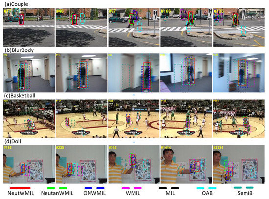 This group of sequences was more challenging than the previous one. The fast motion of the camera and background clutter were the most challenging problems in the Couple sequence. As shown in Figure 7, Table 2, and Table 3, the NeutanWMIL tracker performed the best in the Couple sequence. The OAB and SemiB trackers could not adaptively adjust to these challenges, and they drifted from the ‘couple’, as shown in Figure 10a. As seen in Figure 7, we can see that all the trackers drifted away severely near frame #90, because a very fast motion occurred to the camera. However, as shown in Figure 10a, the ‘couple’ was re-tracked by the NeutWMIL and NeutanWMIL trackers. For the BlurBody sequence, besides the fast motion, the most challenging problems were motion blur and scale variation. As shown in Figure 7, the SemiB tracker drifted away at the very beginning. The related screenshots can be seen by frames #12 and #16 in Figure 10b. As shown by frames #124 and #203, the WMIL, MIL, and OAB trackers drifted for the scale variation and motion blur challenges. From the plots shown in Figure 7, we can find that the NeutWMIL and NeutanWMIL trackers performed the best, the ONWMIL tracker also performed well to some extent. There was background clutter, out-plane rotation, deformation, and scale variation challenges in the Basketball sequence. The OAB and SemiB trackers failed quickly when a player appeared nearby the target, as shown by frame #39 in Figure 10c. The MIL tracker also drifted from the target player after he passed by several other players, as shown by frames #258 and #468. The WMIL tracker ran well until the player passed by several other players with similar color, as shown by frame #664. As shown in Figure 7, Table 2, and Table 3, the NeutanWMIL tracker ran the best for both the BlurBody and Basketball sequences, but the gap between the NeutanWMIL tracker and the NeutWMIL tracker is very small. Challenges like illumination variation, scale variation, occlusion, and rotation were included in the Doll sequence. The WMIL, OAB, and SemiB trackers drifted away quickly, as shown by frames #185, #225, and #742. The NeutanWMIL and ONWMIL trackers could not adaptively adjust to these challenges and drifted from the doll, as shown by frames #1414 and #2324. The proposed NeutWMIL tracker can yield more stable and more accurate results than the other six trackers.