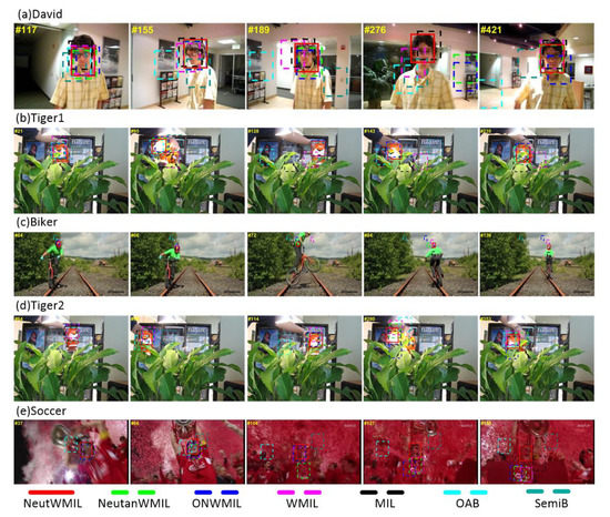 This group had the most challenging sequences. Seven types of challenge were included in the David sequence. Details can be seen in Table 1. The OAB tracker was distracted by the wall because of the similar color, the SemiB tracker drifted from the target mainly due to the challenge of illumination variation, as shown by frames #117 and #155 in Figure 11a. The NeutanWMIL and ONWMIL trackers were also distracted by the wall because of the illumination change and the scale variation, as well as the similar texture between the painting and the target. As seen in Figure 7, Figure 11a, Table 2, and Table 3, the NeutWMIL tracker produced a more robust estimation of object location. For the sequences of Tiger1 and Tiger2, seven types of challenge were included in the Tiger1 sequence, and Tiger2 consisted of eight types of challenge. The SemiB, OAB, WMIL, MIL, and ONWMIL trackers could not adjust to these challenges well, as shown by frames #21, #95, #128, #143, and #235 in Figure 11b, as well as frames #64, #99, #280, and #353 shown in Figure 11d. The performance gap between the NeutanWMIL tracker and the NeutWMIL tracker was very small in the sequences of Tiger1 and Tiger2, as shown in Figure 7, Table 2, and Table 3. The Biker sequence mainly contained challenges like fast motion, scale variation, out-plane rotation, out of view, and low resolution. The OAB and SemiB trackers drifted from the target mainly due to the challenges of scale variation and head rotation, as shown by frames #64 and #66 in Figure 11c. All the trackers failed nearby frame #70, because of a very fast move from the target, as shown by frame #72 in Figure 11c. However, the NeutanWMIL and NeutWMIL trackers snapped to the target again when the target was located within the searching area, as shown by frames #84 and #136. The Soccer sequence had the most challenging problems among the tested sequences. As shown by frame #37 in Figure 11e, the OAB and SemiB trackers drifted away because of the challenges of motion blur and rotation. As seen in Figure 8, we can find the estimation results of the NeutWMIL and NeutanWMIL trackers were not stable between the frame #70 and #120. This is mainly due to the severe occlusion during such a period. The ONWMIL, WMIL, and MIL trackers drifted away after such a long-term occlusion. When the target appeared, the NeutWMIL snapped to the target again, and performed the best in the following frames, as shown by frames #127 and #155.