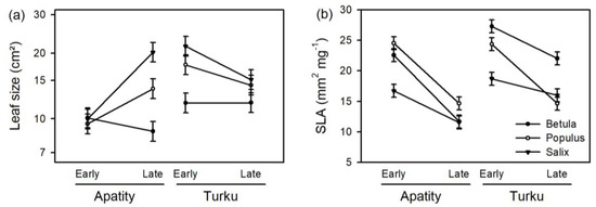 Effects of site (Apatity and Turku), season (early vs. late summer) and species (lines) on (a) leaf size and (b) specific leaf area (estimated from leaf disks 12 mm in diameter) of the leaves used for analyses of chlorophyll fluorescence and asymmetry.
