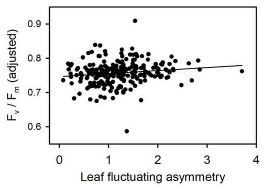 Relationship between the fluctuating asymmetry of a leaf and the maximum efficiency of its photosystem II (Fv/Fm), adjusted for the effects of species, site, measurement date and tree individuals (for the significance of the effect, consult Table 3).