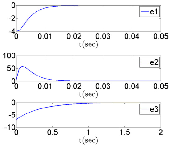 The simulation results are shown in Figure 1, Figure 2, Figure 3 and Figure 4. Figure 1 shows the state responses of master and slave systems corresponding to the proposed control inputs in (12). It shows that the master and slave systems can reach synchronization. Furthermore, Figure 2 and Figure 3, respectively, show the response of the error state and switching surface simulated by the system with the controller (12). In addition, the control input response is shown in Figure 4. From the simulation results, it can be observed that the master–slave system state is quickly controlled and enters sliding mode, , while the master–slave chaotic system error, as expected, converges to zero, and reaches synchronization.